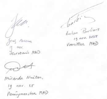 Aldus getekend dd 19 november door onderstaande bestuursleden: